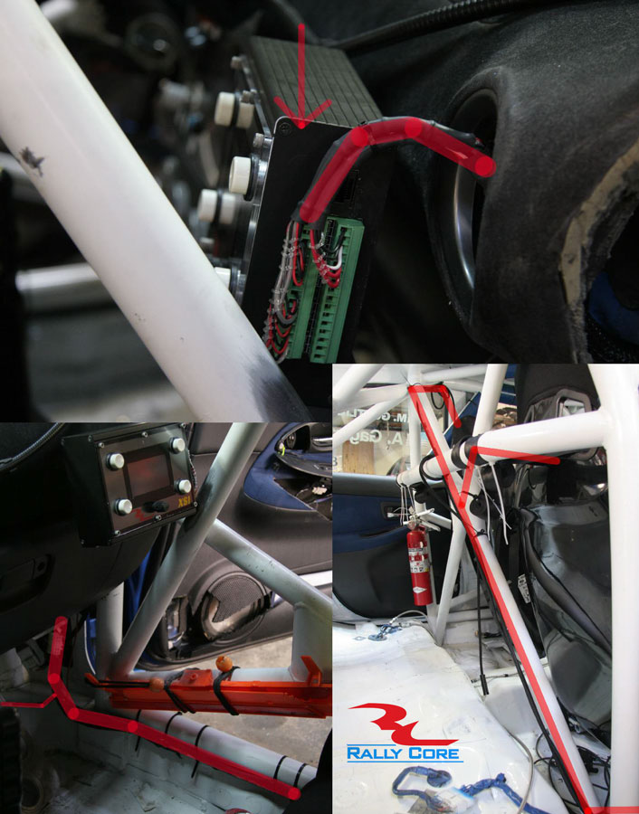The audio harness should then run behind both codriver and driver, where the roll cage can be used to elevate the wiring harness to the desired entry point on the driver and co-driver's seats.